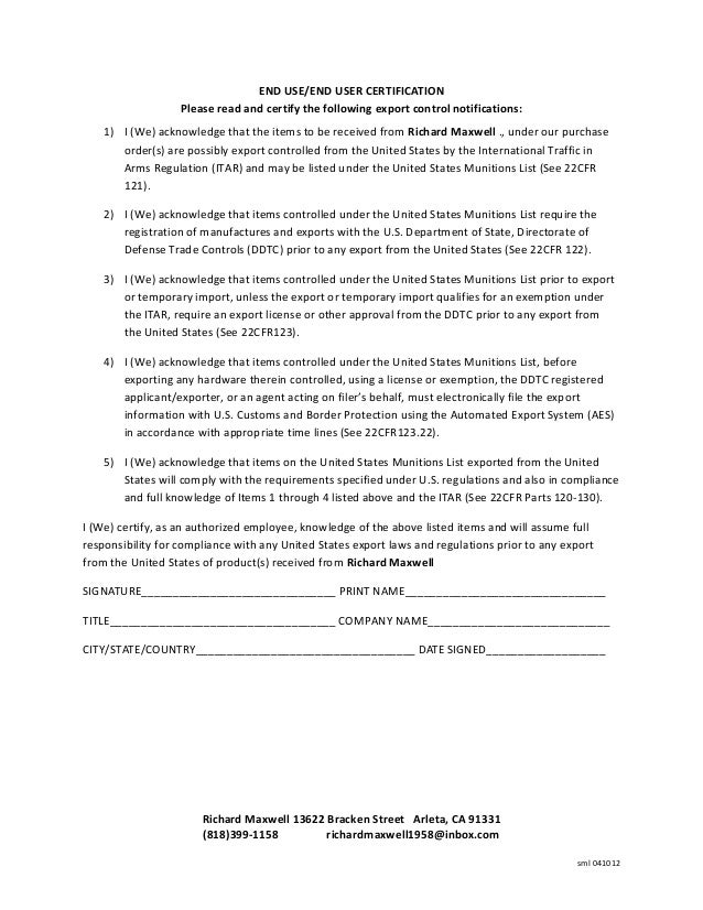 For a full list of end-use and end-user prohibitions under the EAR see 15 Code of Federal Regulations CFR Part 744. They must also supply a covering letter. End-UserEnd Use Certification Purchase Order.